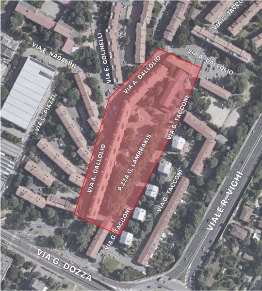 The selected district for the Bologna ULL is Savena, a suburb of the city about 14 kilometres from the centre. Savena is also a modernist post-war development of 5-9 storey apartment blocks surrounded by open spaces. It is mostly residential with some commercial property around Piazza Lambrakis, the site chosen for the lighting intervention.